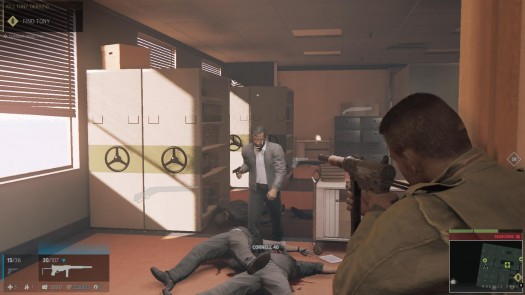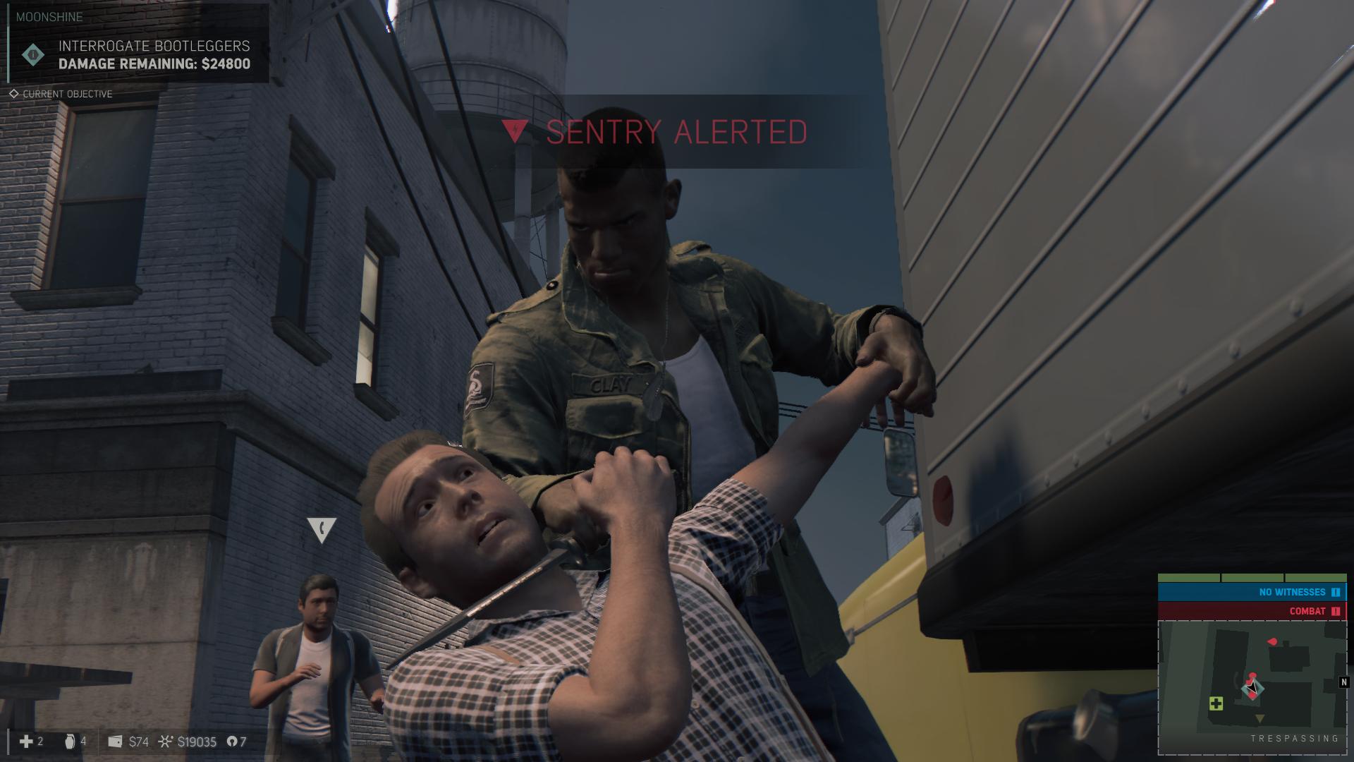 Другият ви вариант за по-директно елиминиране на всичко наоколо изисква оръжие със заглушител. Каквото се намира сравнително рано в играта. Когато се екипирате с такова с пълна сила виждате колко е малоумно AI-то. Буквално е възможно да екзекутирате някой мафиот до негово аверче и реакцията да е почти никаква. Да, при вида на труп враговете започват лежерно да обикалят. Но не са в пълна бойна готовност, не надуват алармата, не викат подкрепления. Което не съм сигурен дали съм го виждал в която и да е игра с подобен тип геймплей, включващ превземане на зони. Винаги като бъде намерен труп гадовете стават супер агресивни, викат още дружки и т.н. Не и тук.