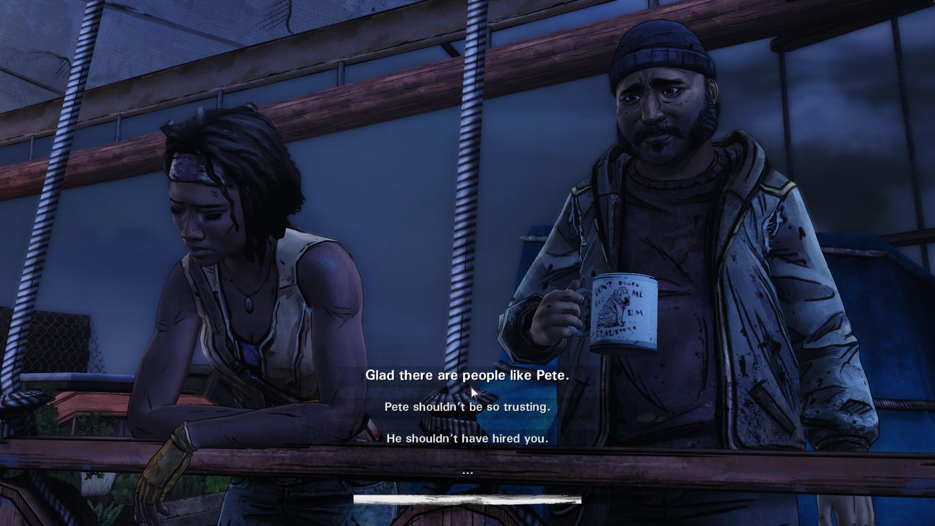 Но всъщност ако трябва да спомена нещо за екшън сцените – и те също са скучни. „Помпай Q, натисни E, сега натисни наляво, после пък надясно“. Както казах и в първия епизод – няма смисъл да са толкова много в сегашния си вид. Имаме някакво бегло подобие на контрол над персонажа ни. При това положение екшън сцените не са наистина екшън, ами интерактивен кинематичен момент. Който трябва да има някакъв смисъл. Както е било почти винаги в заглавията на Telltale... А тук имаме нещо тип „Отивам до супера за хляб и кисело мляко, ама има зомбита по пътя и трябва да избия апатично 5-6, преди да продължа нататък“.