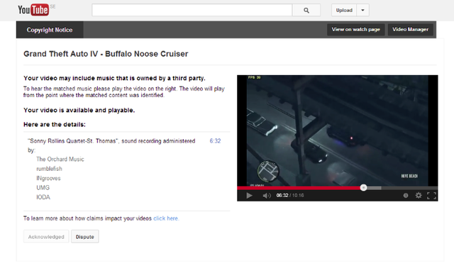 Точно в 6:32 минута, Content ID системата долавя нарушена интелектуална собственост. В обяснението, изпратено към taltigolt пише, че той е използвал нерегламентирано джаз песента St. Thomas на Sonny Rillins Quartet.